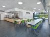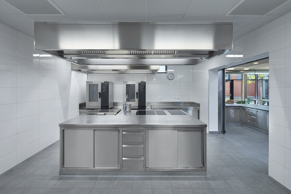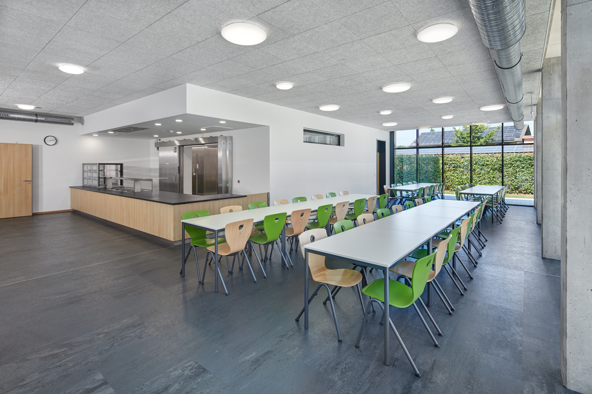 Der Speisesaal ist in 2 Bereiche geteilt. Einem etwas abseitigen Bereich mit Gruppentischen für Kinder der kleinsten Jahrgangsstufen. Sie essen dort zusammen mit ihren Betreuungskräften und erlernen gemeinsames Ein- und Abdecken. Der andere Bereich ist ein klassischer Mensabereich mit Tischreihen zur freien Platzwahl. Die Essensausgabe erfolgt über ein Tablettsystem.