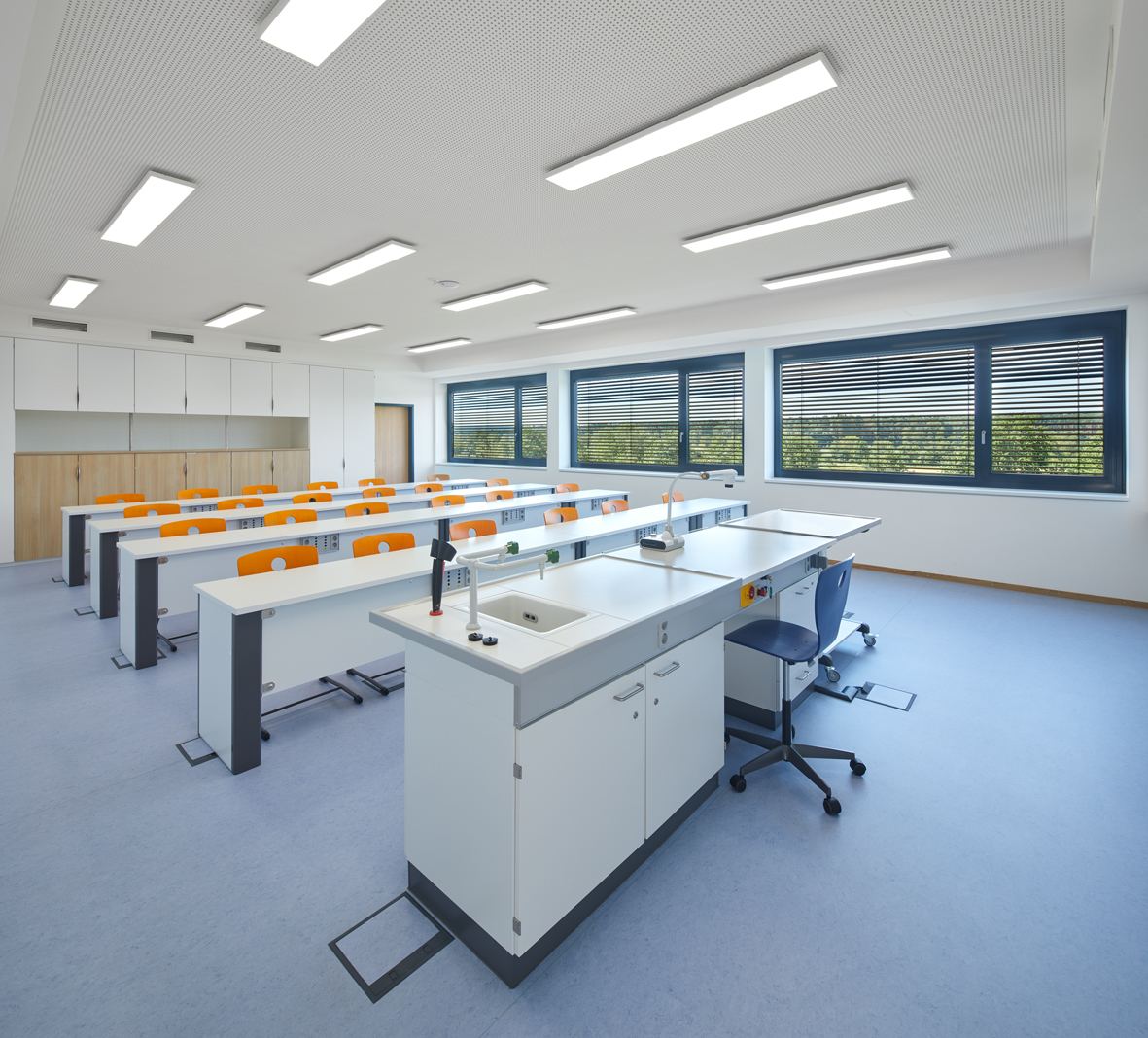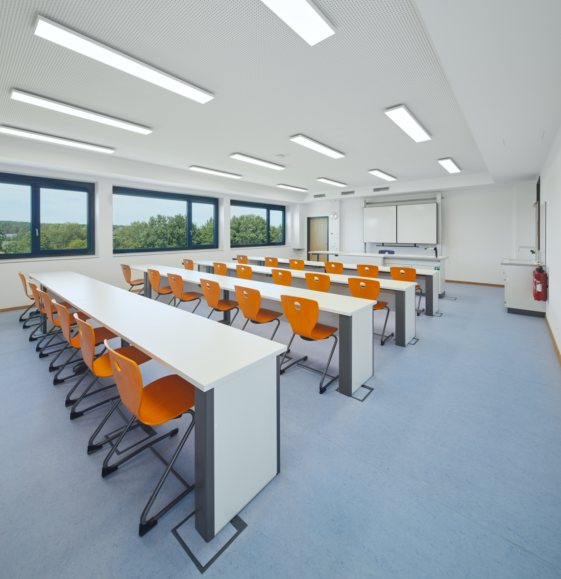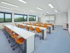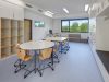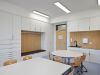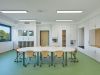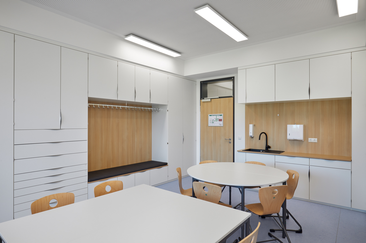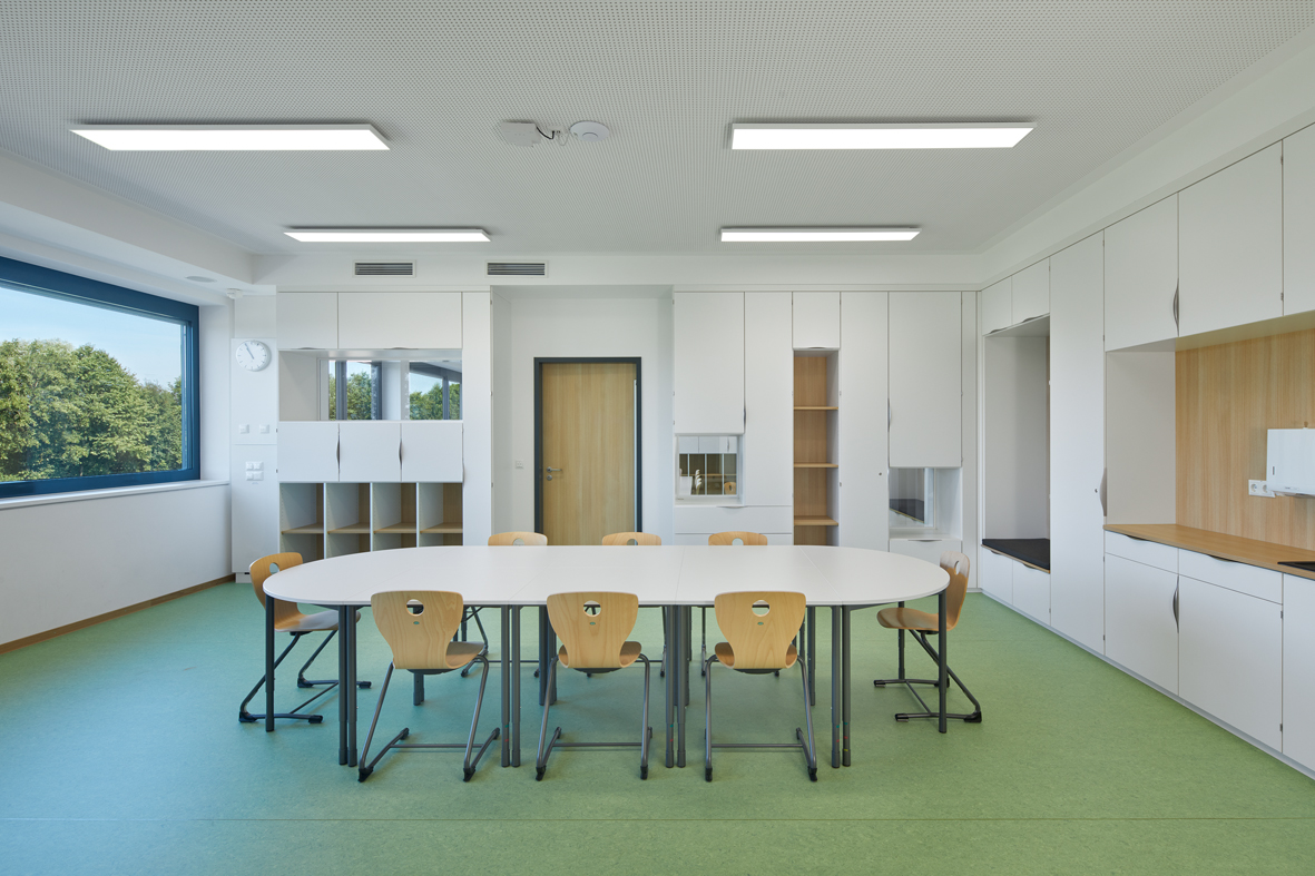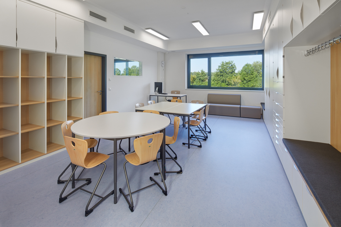 Im untersten Geschoss befinden sich die Ganztagsräume der Mittelschule mit Wartebereichen für Schüler und Eltern und der Speisesaal mit Vollküche für die Speisenzubereitung. Das mittlere Geschoss beinhaltet den Ganztagsbereich für die Grundschule und die zugehörigen Personalräume. Das Gebäude ist über eine Übergangsbrücke vom Bestandsbau aus zugänglich.