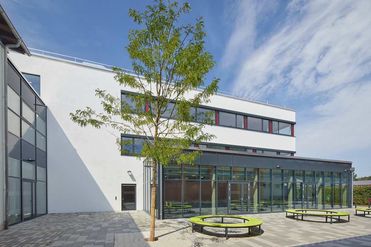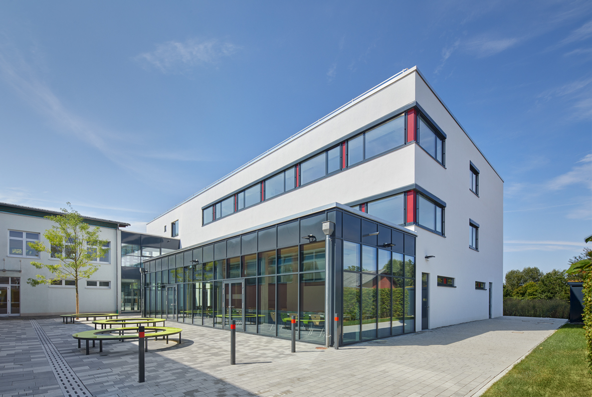 Durch ein zu erwartendes höheres Schüleraufkommen in den nächsten Jahren und einer erfolgten Überprüfung des erforderlichen Raumprogramms hat der Marktrat Siegenburg entschieden, die Herzog-Albrecht-Schule umzubauen und mit einem Neubau zu erweitern, um das aktuelle Raumprogramm zu erfüllen. Die unteren Geschosse sind mit den Bereichen der Ganztagsbetreuung für Grund- und Mittelschule belegt. Das oberste Ge-schoss mit den Fachräumen der Mittelschule (EDV, PCB und Musik).