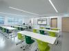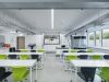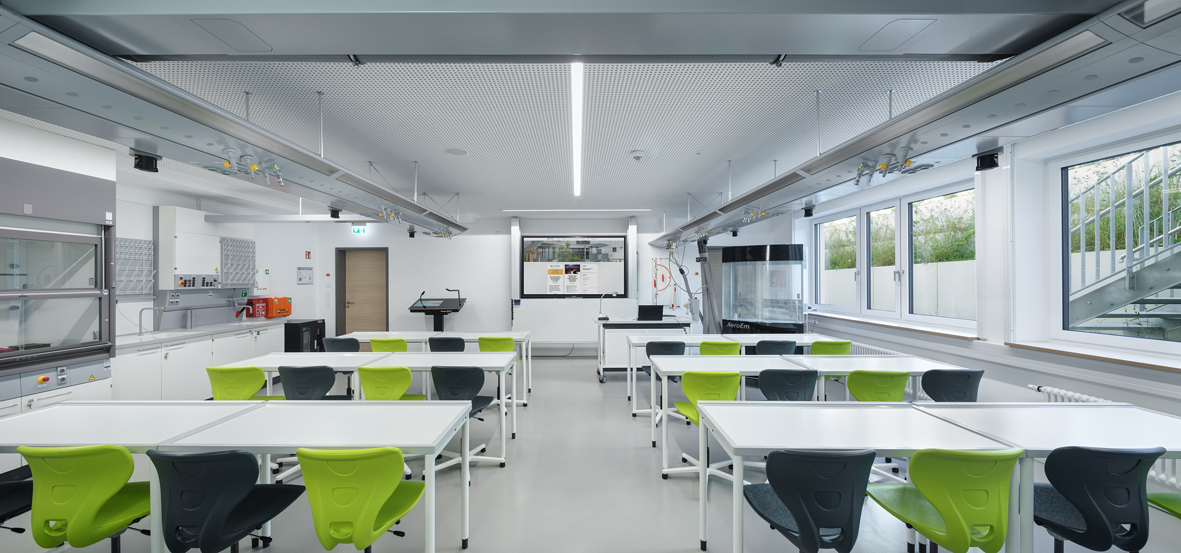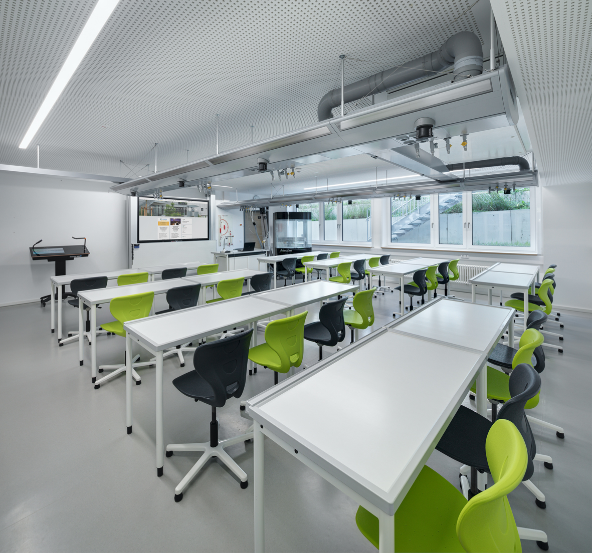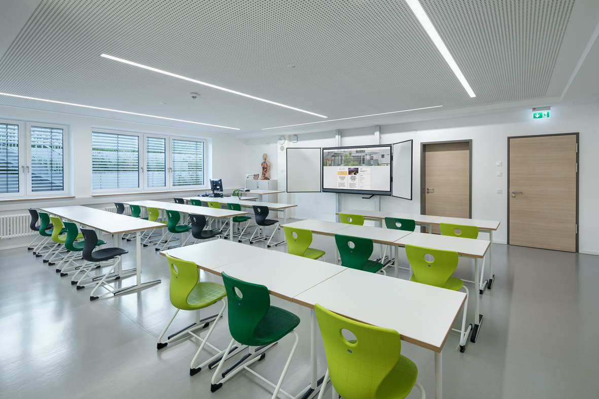 Die funktionale Gliederung folgt einem klaren Nutzungskonzept: Im Untergeschoss sind naturwissenschaftliche Fachräume, unter anderem für Physik und Chemie, angeordnet. In den darüberliegenden Geschossen befinden sich flexibel nutzbare Klassenräume. Das Dachgeschoss bildet eine Erweiterung des Lehrerbereichs im Bestand und schafft zusätzliche Aufenthalts- und Arbeitsflächen.