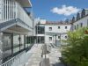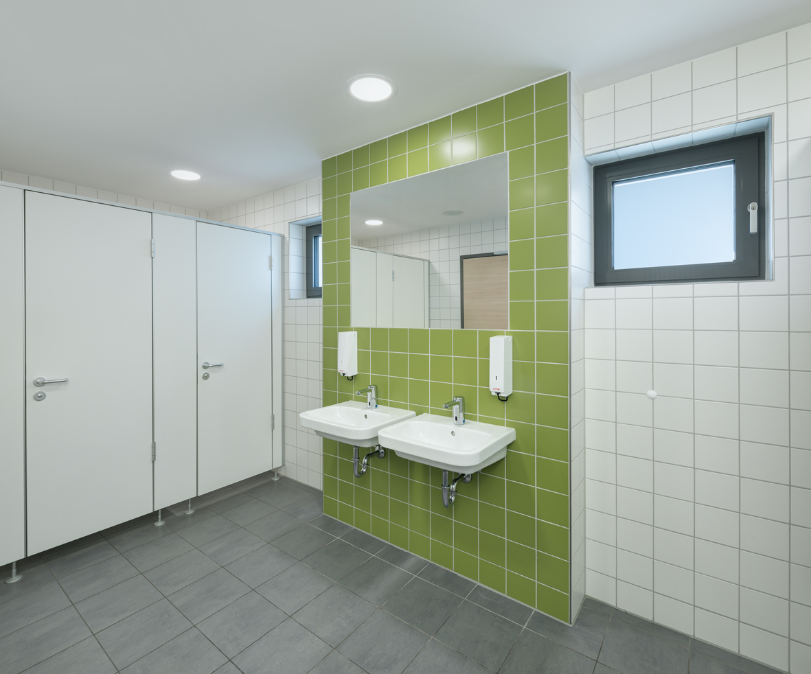 Ergänzend zum Hochbau wurden die Außenanlagen neu gestaltet. Ein zentraler Innenhof sowie die terrassierten Außenbereiche im Anschluss an die Fachräume im Untergeschoss wurden zu qualitätsvollen Aufenthaltszonen entwickelt und werten das schulische Umfeld nachhaltig auf.