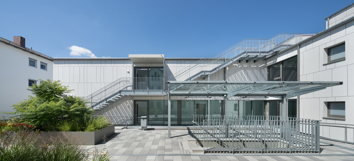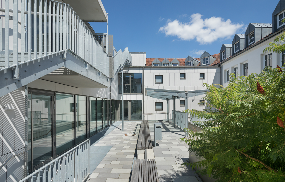 Ein zentrales Element der Planung ist die barrierefreie Vernetzung beider Gebäudeteile: Über den Verbindungsgang wird ein Aufzug integriert, der eine durchgängige Zugänglichkeit sicherstellt. Gleichzeitig verbessert der Neubau die brandschutztechnische Situation, indem ein zweiter Rettungsweg aus dem Bestand geschaffen wurde.