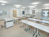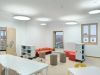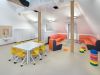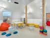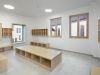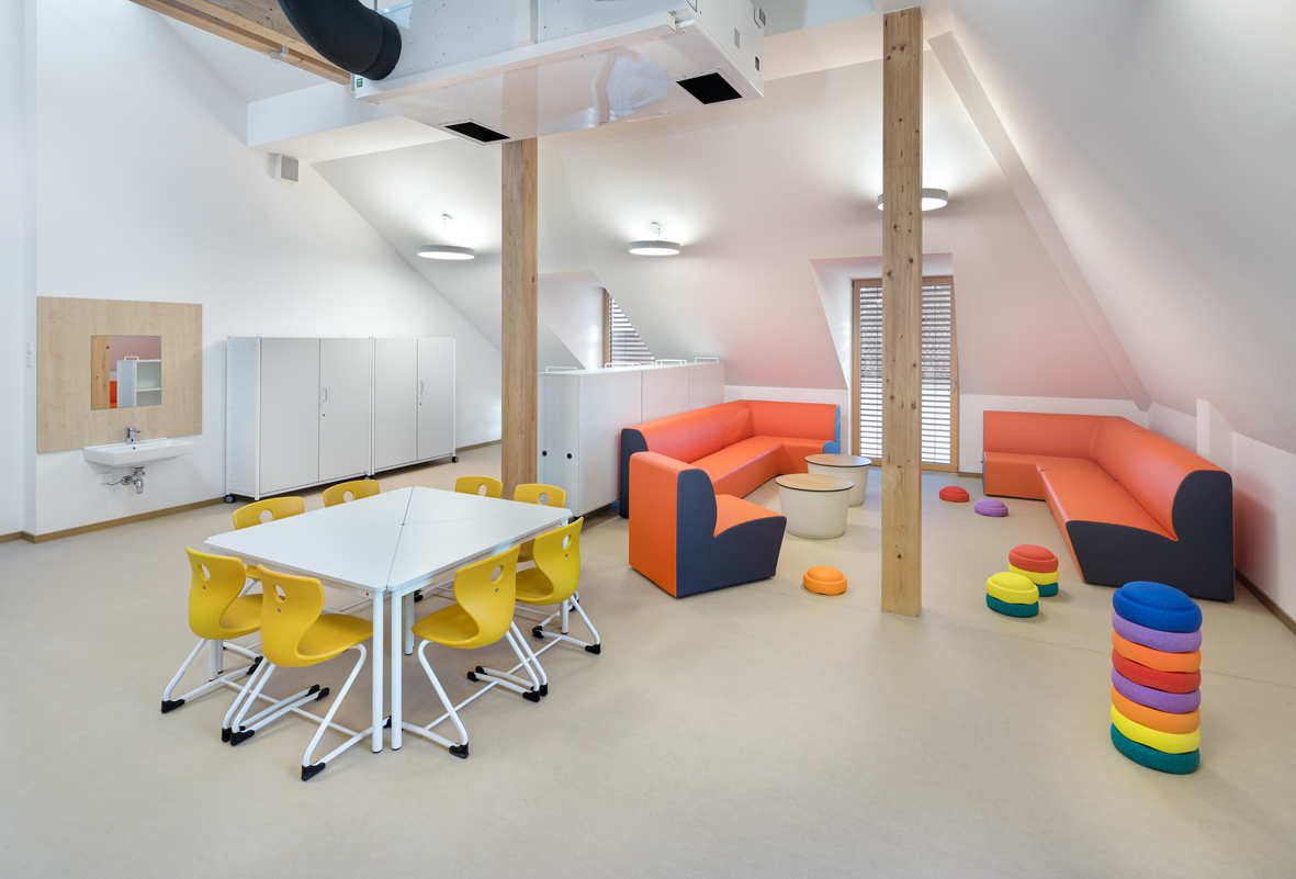 Der Neubau wurde unmittelbar an den Pausenhof angebunden und über einen überdachten Verbindungsgang von der Pausenhalle aus zugänglich gemacht. Der Haupteingang befindet sich an der Nord-Ost-Seite, die dem Pausenhof zugewandt ist. Im Erdgeschoss gelangt man durch das Foyer zu einem geschlossenen Haupttreppenhaus mit Aufzug. Neben diesem befinden sich Garderoben für die Schüler und eine WC-Anlage. Der Hauptbereich umfasst zwei Aufenthaltsräume für die Kinder. Im ersten Obergeschoss befinden sich weitere Aufenthaltsräume sowie ein Ruheraum und eine Sanitäranlage. Fenster-Elemente in den Innenwänden der Aufenthalts- und Ruheräume sind geplant, um Transparenz zu gewährleisten oder auf eine Reduzierung des Aufsichtspersonals einzugehen. Im Untergeschoss wurde eine Aufbereitungsküche angelegt, die zum Speisesaal hin offen ist. Hier können die geplanten 125 Schüler in zwei Schichten ihr Mittagessen einnehmen.