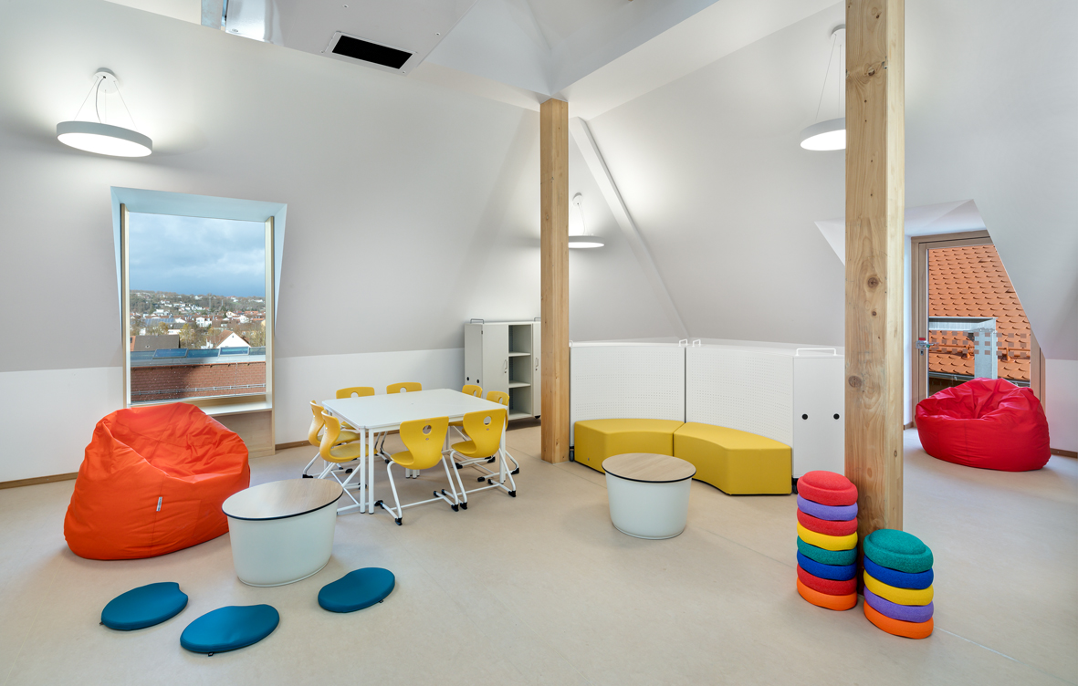 Das zu sanierende Gebäude befindet sich südlich und topografisch oberhalb des städtischen Rathauses in der Kirchengasse. Das ehemalige Krankenhaus stammt aus dem Jahr 1862. Es wurde bereits einer denkmalpflegerischen Befundung unterzogen und steht unter Ensembleschutz, ist jedoch kein Einzeldenkmal. Die bestehende Schule, das ehemalige Krankenhaus und der Neubau für die Offene Ganztagsschule umschließen den bestehenden Pausenhof auf drei Seiten. Die Erweiterung der Pausenhalle erfolgte durch einen Anbau an die bestehende Turnhalle, der eine filigrane Pfosten-Riegel-Konstruktion mit Glas-Elementen und ein Flachdach mit Begrünung erhält. Der Hauptzugang zum Archiv erfolgte über die Nord-Westseite, entweder über die Außentreppe oder barrierefrei durch den geplanten Außenaufzug.