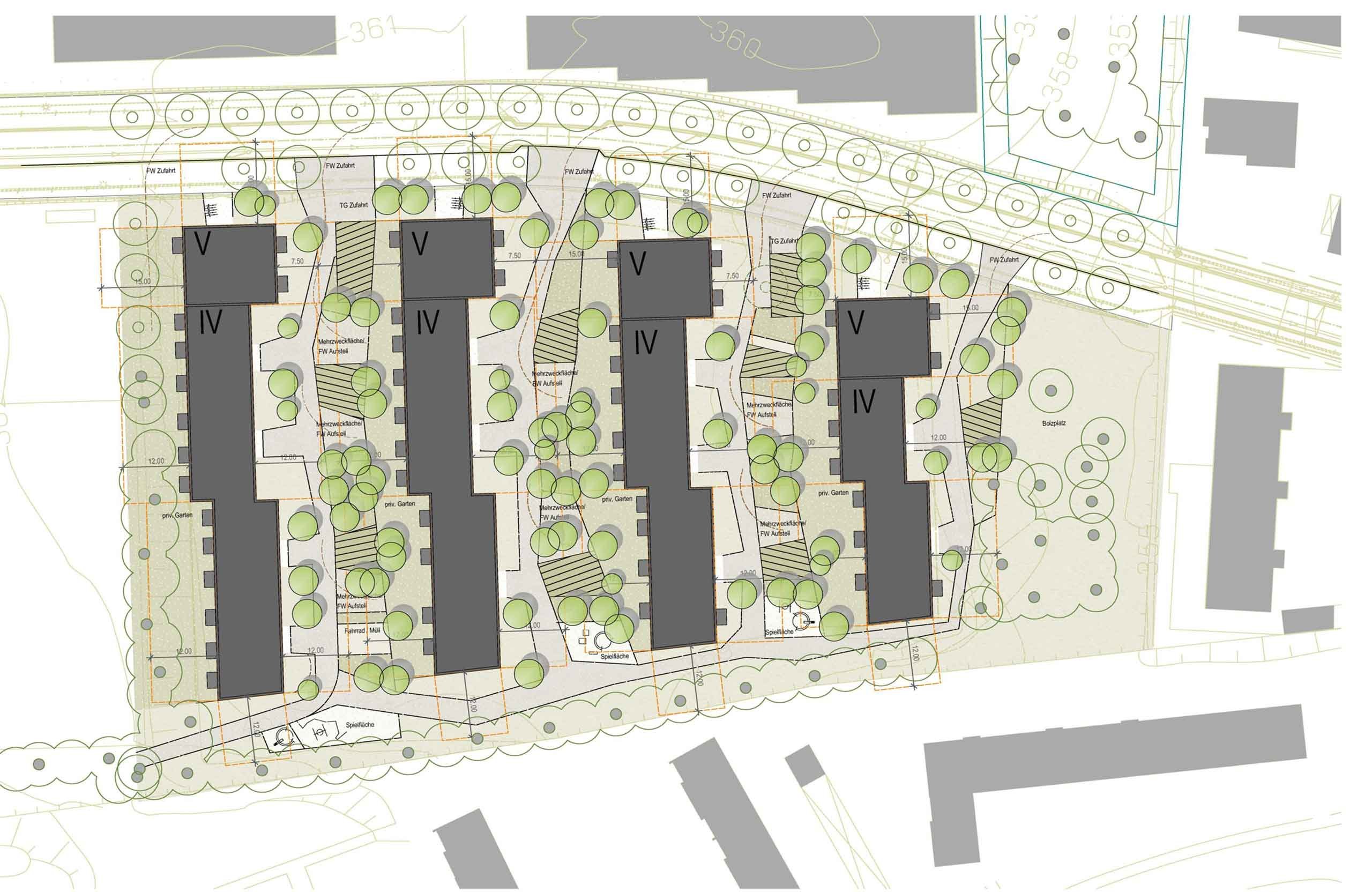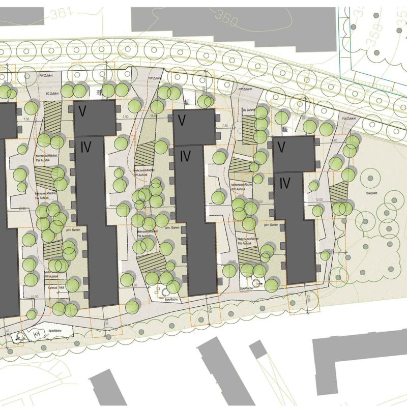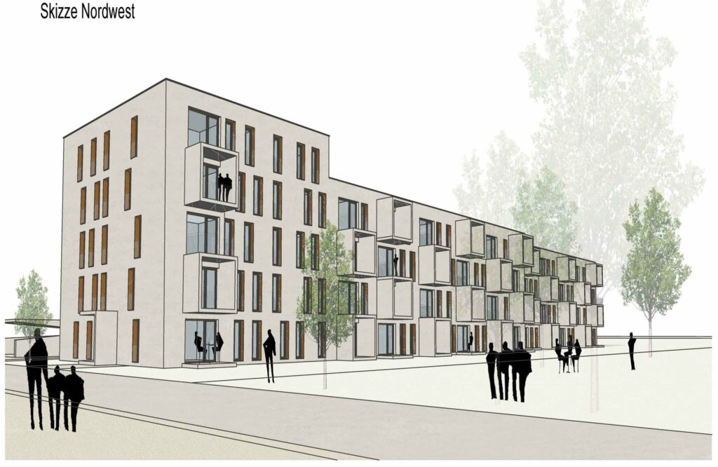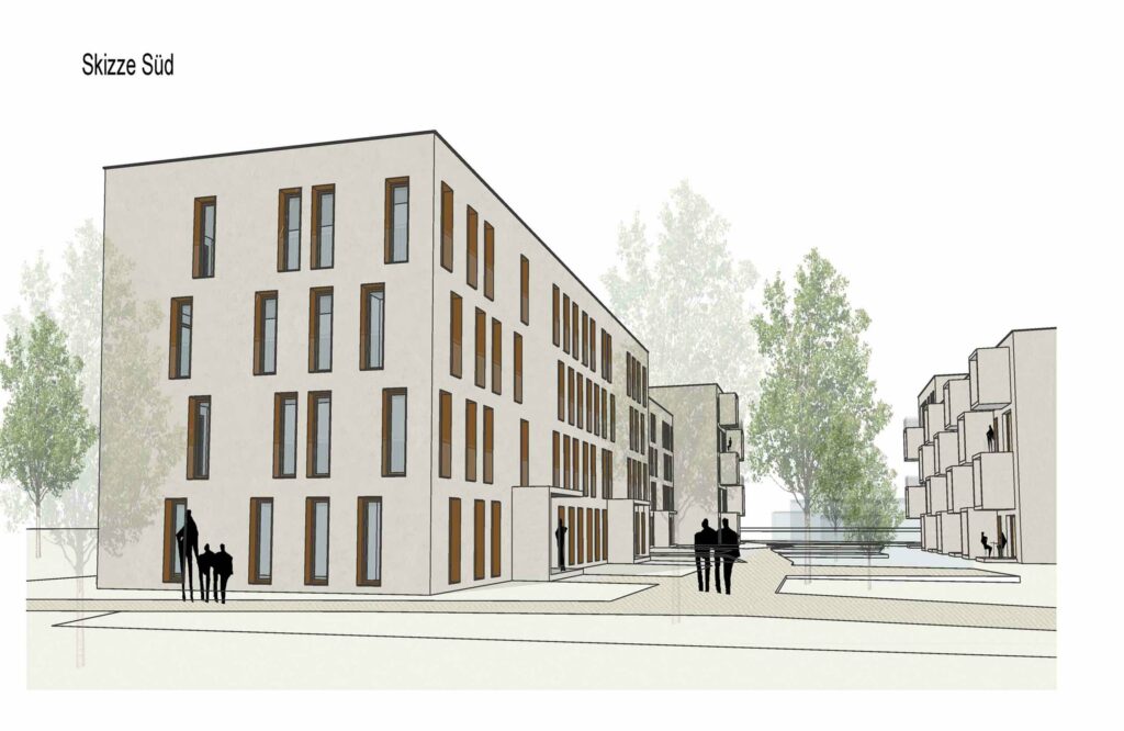 Die städtebauliche Anordnung nimmt die südlich angrenzende Zeilenstruktur auf und führt sie bis zur Haupterschließung im Norden weiter. Im Bereich der Straße werden 5- Geschossige Kopfbauten angeordnet. Damit gelingt eine angemessene Fassung des Straßenraums. Durch die Zeilenstruktur wird der südlich an der Grundstücksgrenze vorhandene Grünzug städtebaulich bis zur Erschließungsstraße wirksam. Gleichzeitig gelingt die stadträumliche Verknüpfung mit dem angrenzenden Gebäudebestand. Durch die Ost- West Ausrichtung der Baukörper sind optimale, durchgesteckte Wohnungsgrundrisse möglich. Die gestaffelten Baukörper, mit städtebaulichem Abschluss der Zeilen an der Nordseite schaffen maßstäbliche, teilprivate Innenräume, ohne diese zu den öffentlichen Räumen im Norden und Süden abzuriegeln.