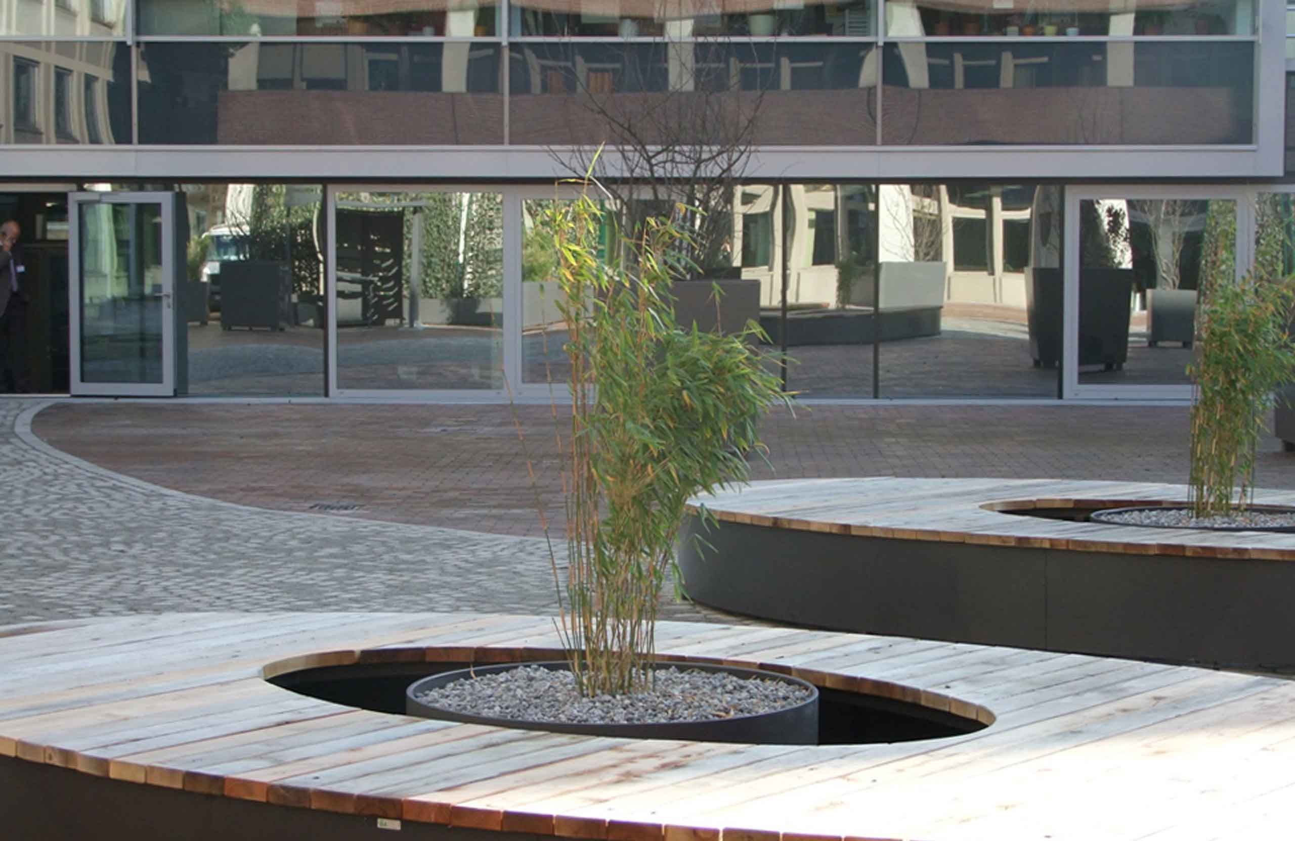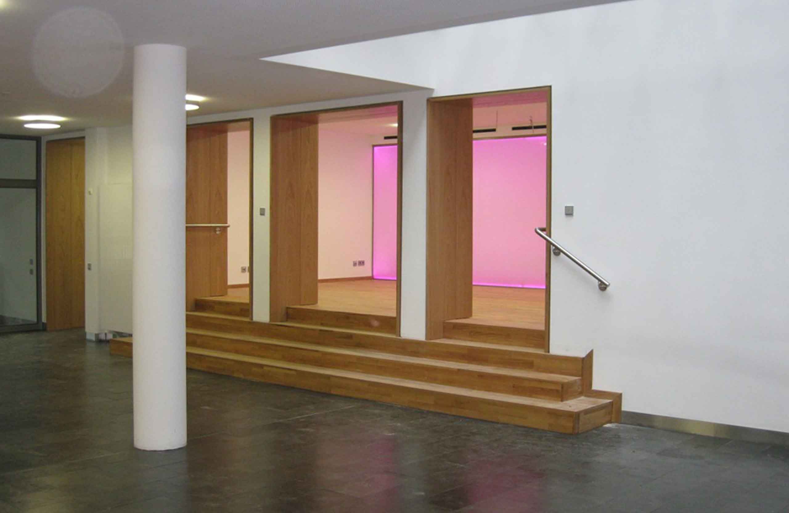 Ein von der Maximilianstraße bis zum Innenhof durchgestecktes Foyer bildet die Erschließungsachse im Erdgeschoss. Daran seitlich angelagert liegen in den Dunkelzonen des Bestandsgebäudes die WC-Anlagen und ein etwas erhöhter Lounge-Bereich. Das Foyer wird in einem Teilbereich mit einem Glasoberlicht zusätzlich belichtet. Vom Innenhof aus ist der Neubau behindertengerecht erschlossen. Der äußere Zugang von der Maximilianstraße aus wird nur bei größeren Veranstaltungen im Tagungsbereich benutzt. Der Hauptzugang erfolgt über Eingang „Am Alten Viehmarkt“. Zum Innenhof ist ein großer Sitzungssaal mit Rückprojektionsanlage angeordnet. Der bestehende Niveauunterschied wird durch eine Treppen- und Sitzstufenanlage ausgeglichen. Im geteilten Zustand kann der Sitzungssaal vom Foyer bzw. über einen Verbindungsflur separat erschlossen werden. Die Erdgeschossfassade öffnet sich mit großzügigen Schiebeelementen zum ruhigen Innenhof. Als Bindeglied zu zwei weiteren Tagungsräumen, welche zur Maximilianstraße hin orientiert sind, gibt es eine innenliegende Funktionszone mit Teeküche, Stuhllager und Garderobe.