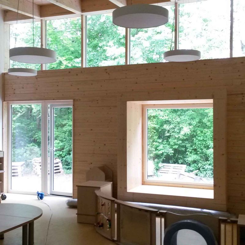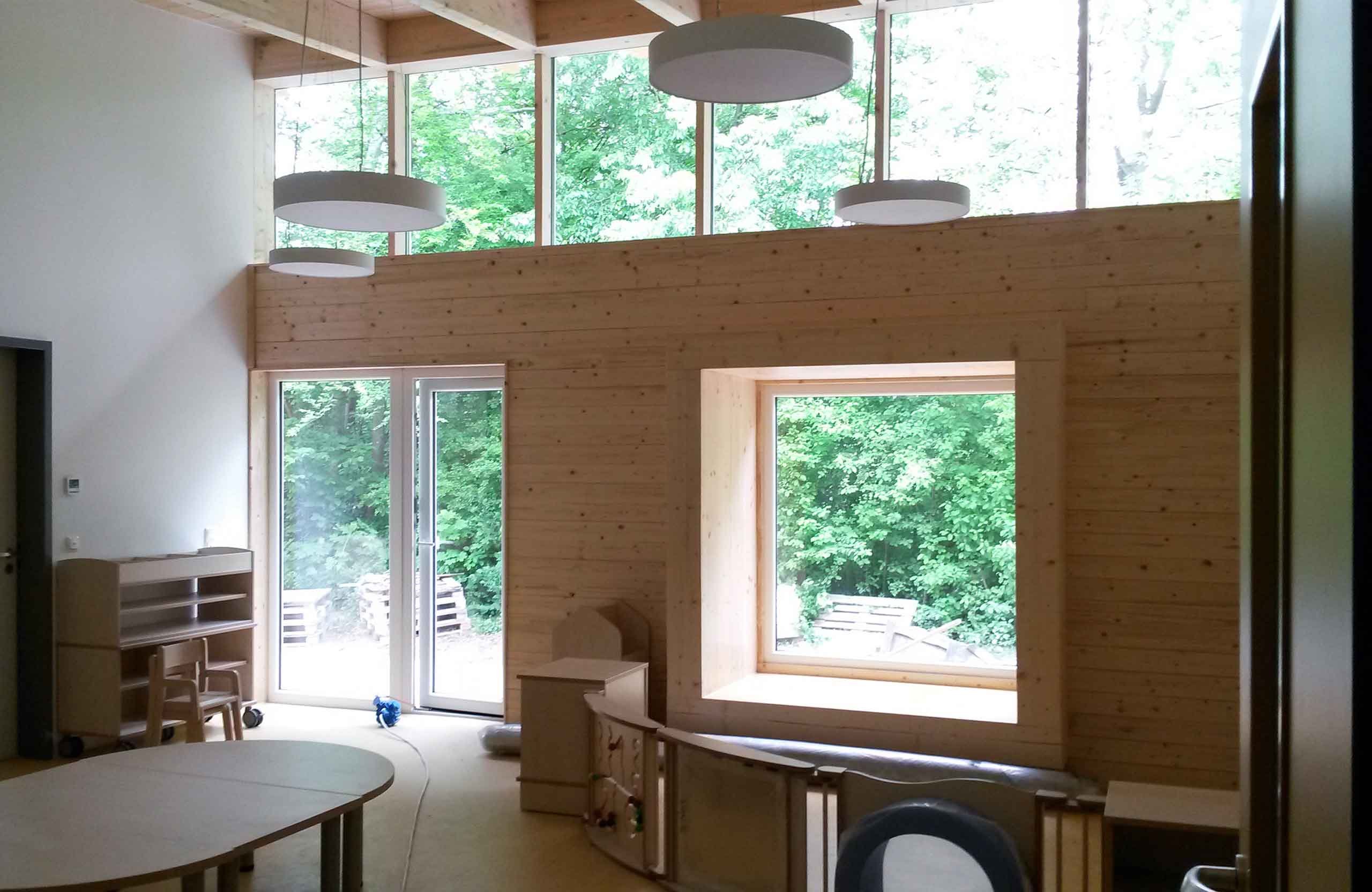 Nach einer Bauzeit von rund einem Jahr ist am 01.09.2014 auf dem Gelände des Bezirksklinikums Regensburg die neue Kinderkrippe MedBo-Spatzennest feierlich eingeweiht worden. In zwei Gruppen können rund 24 Kinder im Alter von sechs Monaten bis drei Jahren betreut werden. Mit der Kinderkrippe wurden auch Räumlichkeiten für das Zusatzangebot einer Ferienbetreuung geschaffen. Betreiber der Kinderkrippe ist die Johanniter-Unfall-Hilfe. Das gesamte Raum- und Funktionsprogramm ist barrierefrei in einem ebenerdigen, quadratischen Baukörper in Holzrahmenkonstruktion untergebracht. Der zentrale Elternwartebereich, die Gruppenräume sowie die Nassräume wurden mit Oberlichten ausgestattet. Von den Gruppen- und Ruheräumen sind direkte Ausgänge ins Freie vorhanden. Die Außenfassade ist mit einer senkrechten Lärchenholzleistenschalung verkleidet. Die Innenwände wurden in Teilbereichen mit Holz verschalt bzw. mit einer Trockenbauschale in Gipskarton verkleidet.