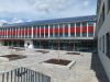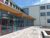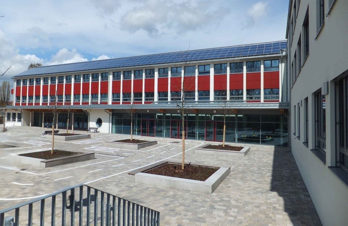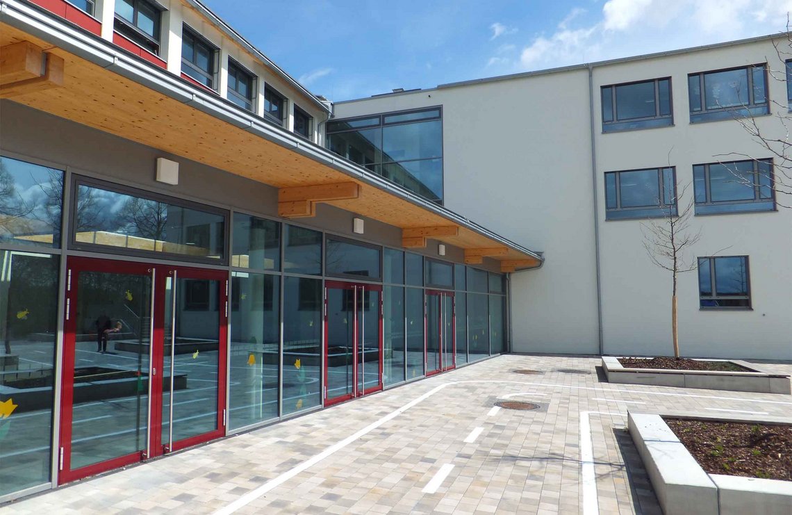 Das 3-geschossige Bestandsgebäude mit Satteldach spiegelt den gestalterischen Zeitgeist der beginnenden 60er Jahre wieder. Der feingliedrige Stahlbetonskelettbau mit aussteifenden Mauerwerksscheiben und enger Fassadenstützenstellung weist erstaunliche Spannweiten auf, die mit Kassetten-/ Rippendecken der damaligen Zeit bewältigt wurden. Die Klassenzimmer der zwei Hauptgeschosse werden direkt von den beiden Treppenhäusern aus erschlossen. Aus diesem Entwurf- und Konstruktionsansatz waren massive Brandschutzprobleme sowie aktuelle Themen der energetischen Sanierung zu bewältigen, ohne dabei den unverwechselbaren Charakter der Fassade zu verändern. Das Sockelgeschoss wurde durch eine konische Pausenhalle ergänzt. Senkrecht zum Bestandsgebäude wurde ein 3-geschossiger Anbau angefügt, der die Fachklassen, den Lehrerbereich und den Hort aufnimmt. Der winkelförmige Gesamtkomplex umschließt einen neugegliederten Pausenhof. Auf Grund fehlender Nebenräume und Lagerflächen wurden im Außenbereich ergänzende Zubauten in einer Holzkonstruktion für Räder-, Müll-, Hausmeister- und Außengerätraum geplant.