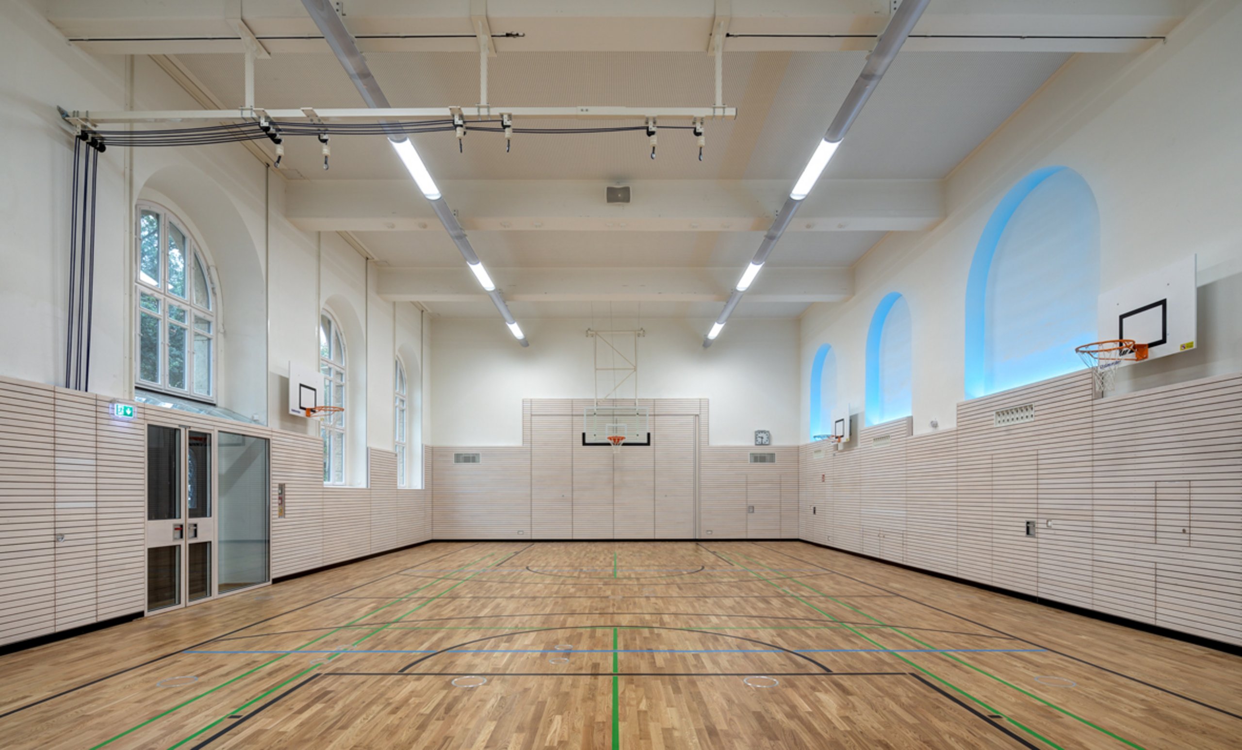 Die LED-Beleuchtung läßt die sanierten Turnhallen erstrahlen.