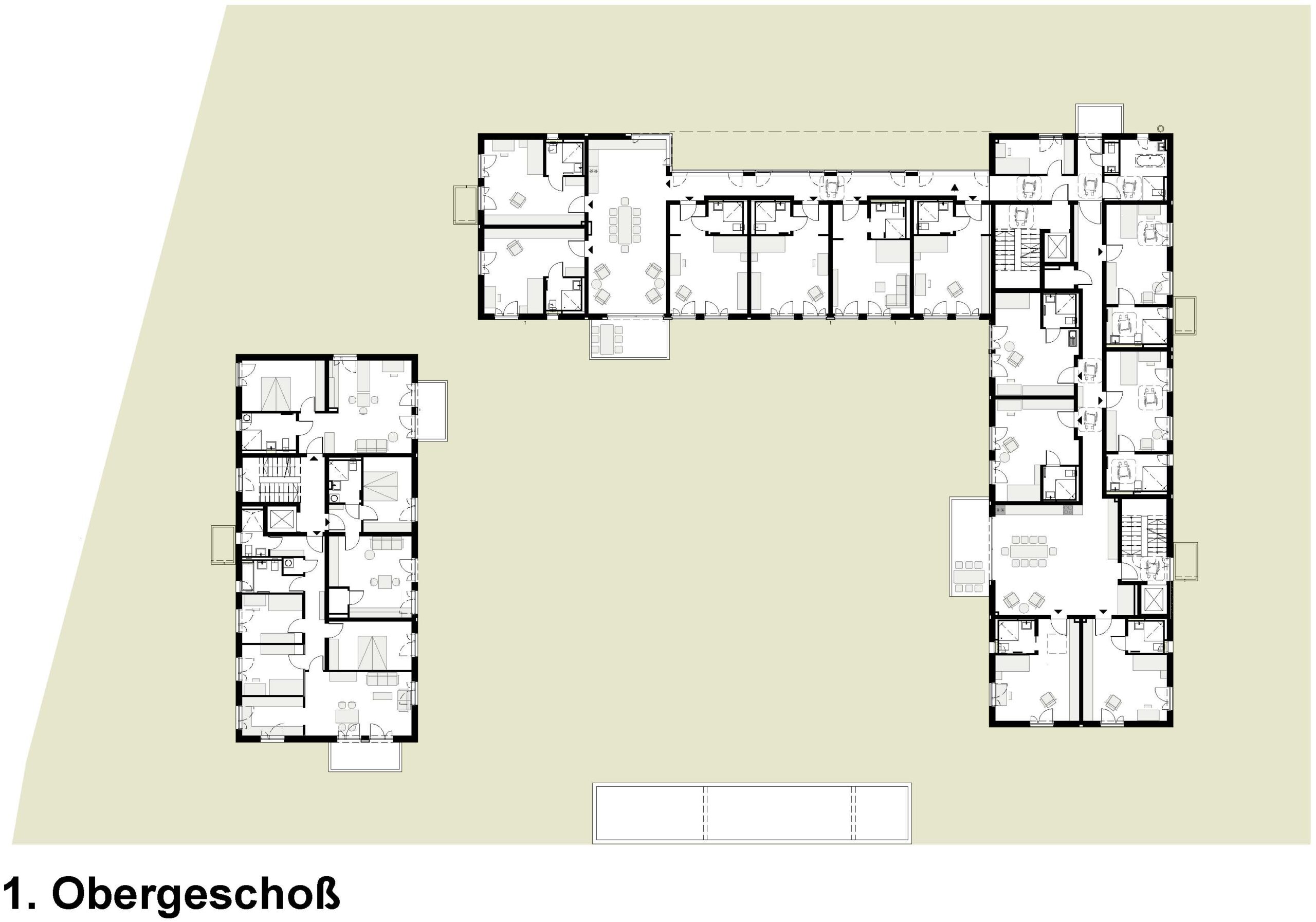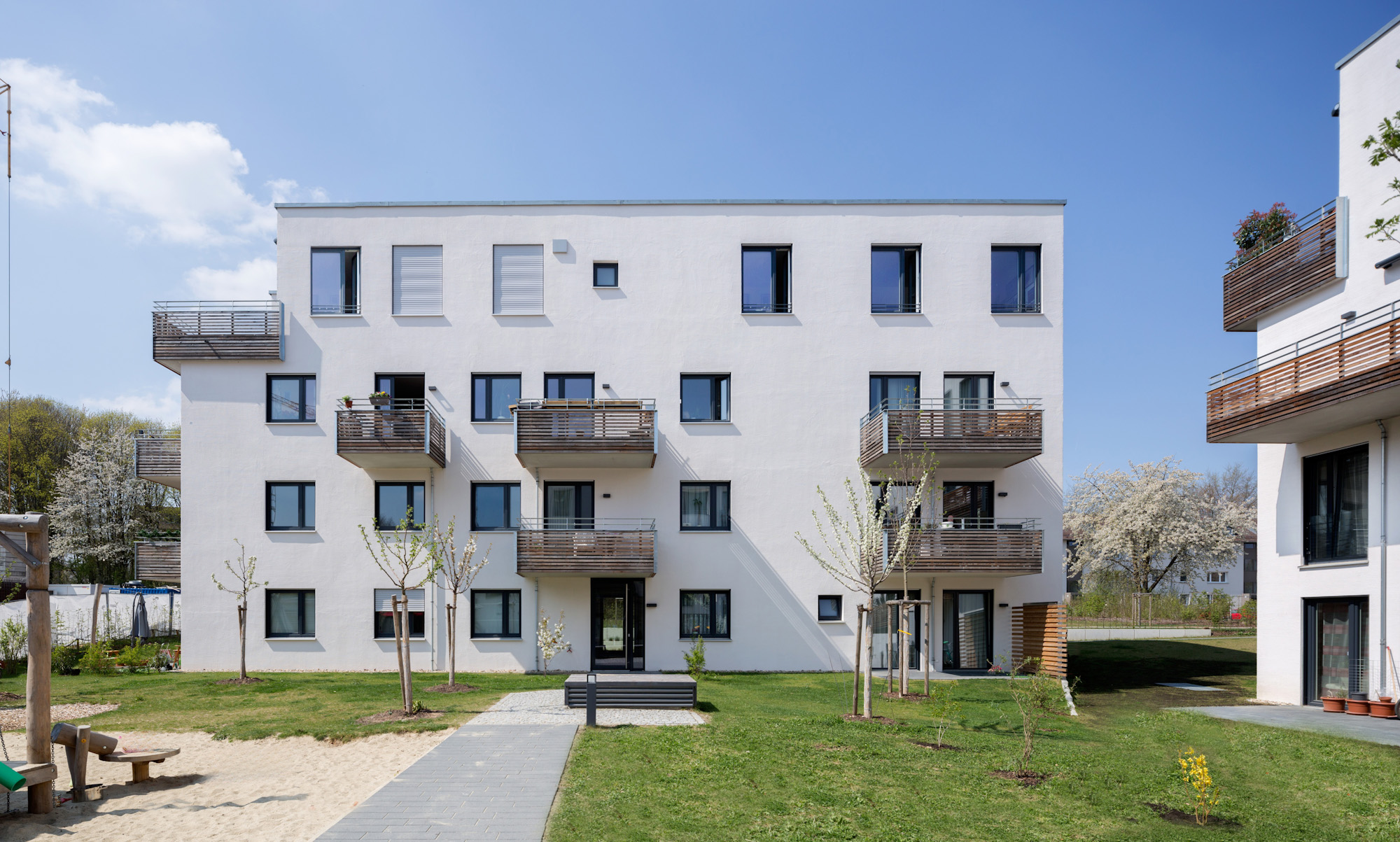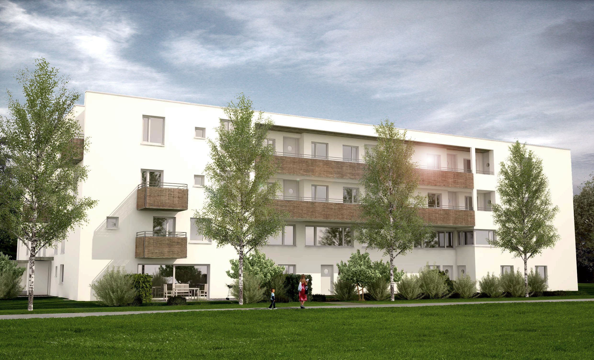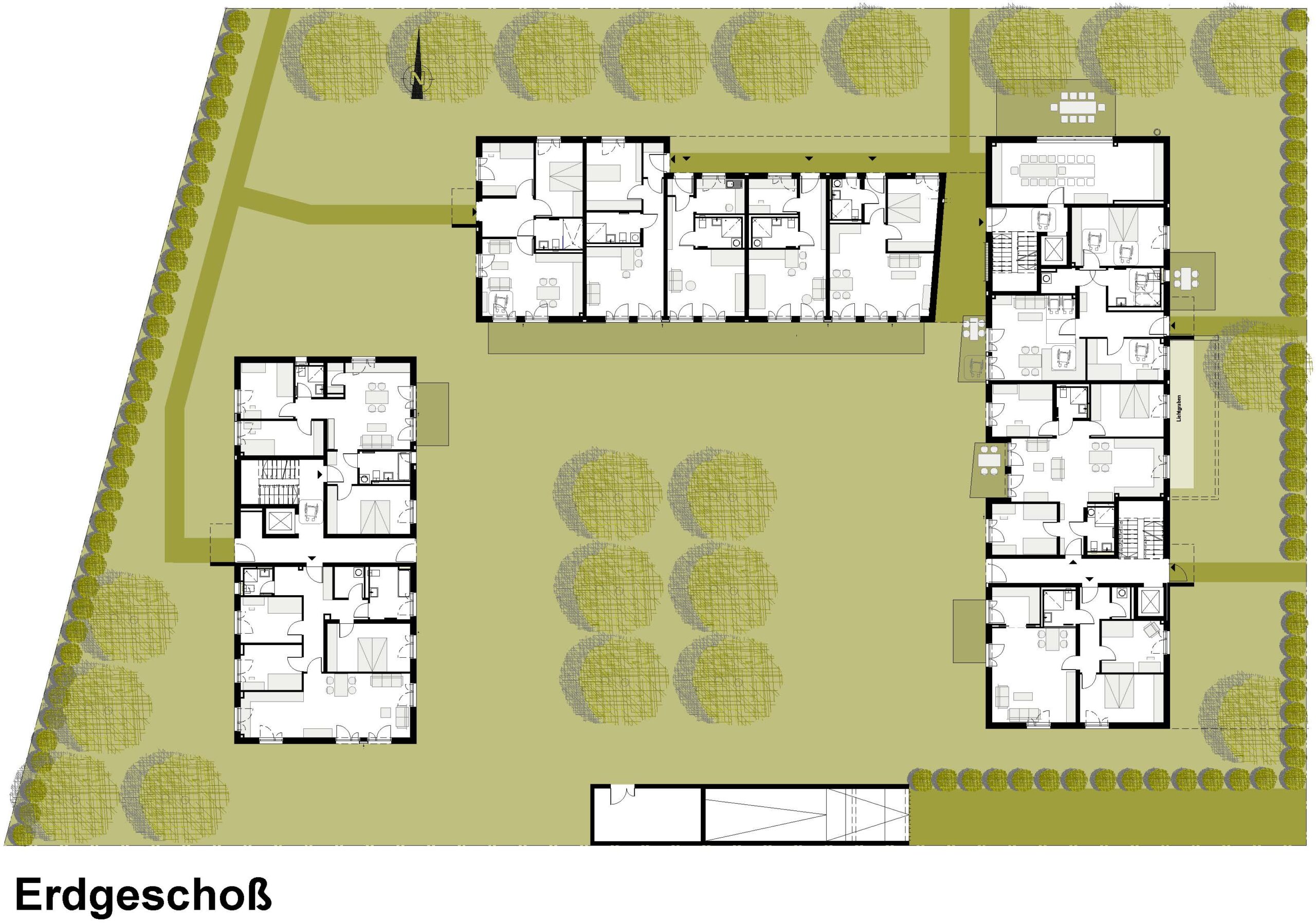 Die Wohneinheiten werden über je ein Treppenhaus mit Aufzugsanlage vom Keller bis zum 3. OG erschlossen. Der Innenhof ist im EG von jedem Treppenhaus aus unmittelbar erreichbar. Sämtliche Wohnungen verfügen über Terrassen oder Balkone, die barrierefrei erreicht werden können. Sowohl im EG als auch im Kellergeschoss wurden Gemeinschaftsräume geplant. Alle Wohneinheiten, die Tiefgarage und die Gemeinschaftsräume sind barrierefrei erschlossen. Die Wohnanlage wird in besonders effizienter Massivbauweise ohne Polystyrolhaut errichtet (Energieeffizienzklasse KfW 70 gemäß EnEV 2013). Warmwasser und Heizung sollen mit regenerativen Energien erzeugt werden.